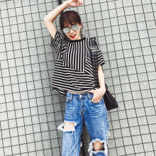 T恤女高领黑白条纹短袖夏季2017春夏装新韩版宽松百搭上衣打底衫