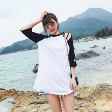 春夏韩版露肩五分袖T恤女夏装学生中长款宽松七分袖体恤打底潮