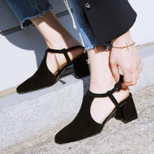 韩版2017春季显瘦方头深口中空一字扣粗跟凉鞋女包头高跟鞋单鞋潮