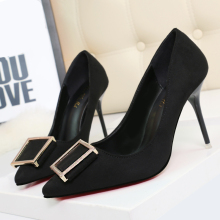 欧美简约性感显瘦细跟高跟浅口尖头绒面方扣女单鞋女高跟鞋