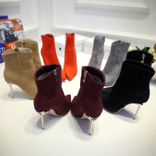欧美秋冬新款裸色尖头高跟10cm金属细跟性感女短靴黑色绒面裸靴