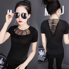 2017夏新款女T恤纯色短袖黑色网纱拼接美背小香风女上衣半袖打底