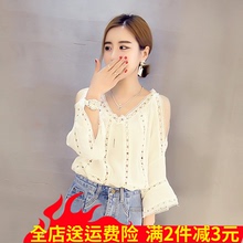 夏韩范甜美仙女气质肩部性感镂空V领七分袖宽松雪纺衫女白色上衣