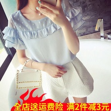 夏新款荷叶边喇叭袖雪纺上衣韩版修身学院风短袖圆领雪纺衫女大码