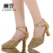澜萱金色女式拉丁舞鞋春夏低中跟软底跳舞鞋成人广场舞摩登舞蹈鞋