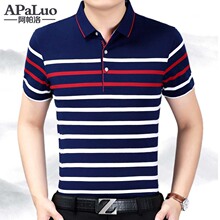 新款中年男士短袖t恤夏季翻领条纹上衣中青年男士商务休闲纯棉T恤