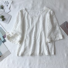 春夏新款七分袖白色蕾丝衫修身打底衫短款镂空罩衫蕾丝上衣