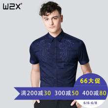 w2x夏季韩版英伦修身短袖衬衫 青年男士薄款刺绣休闲型纯色衬衣潮