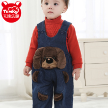 男宝宝牛仔背带裤双层秋冬长裤 婴儿摇粒绒0-1-2岁女护肚可开档裤