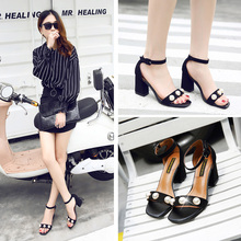 粗跟凉鞋女夏2017新款百搭高跟罗马女鞋性感露趾珍珠一字扣带凉鞋