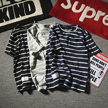 宽条纹 夏季欧美港风潮流男装 国潮街头青少年休闲宽松短袖T恤