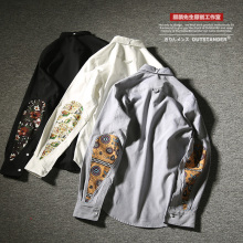 肘部花卉拼接 春季日系复古衬衣 民族风男士潮流休闲修身长袖衬衫