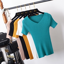 韩国2017春夏装新款纯色V领短袖针织打底衫弹力套头修身露背T恤女