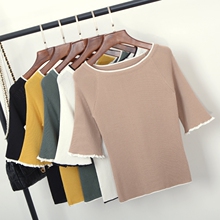 春季新款韩版修身显瘦拼色一字领喇叭袖针织衫中袖冰丝打底上衣女