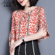 小衫女2017新款名媛时尚修身显瘦花色喇叭袖衬衫上衣夏季雪纺衫女