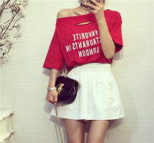 2017夏季新款韩版一字领露肩短袖体恤百搭字母印花切口T恤女上衣