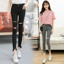 黑色破洞打底裤女九分裤春夏薄款高腰学生牛仔裤弹力紧身小脚裤子