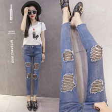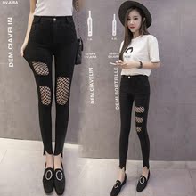 破洞牛仔裤女春夏季2017新款渔网高腰九分小脚铅笔韩版显瘦裤子潮
