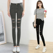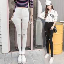 春款黑色破洞打底裤女外穿薄款大码女装长裤弹力紧身小脚裤铅笔裤