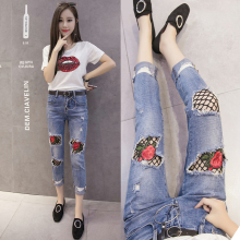 渔网破洞玫瑰刺绣牛仔裤女春夏季新款翻边百搭显瘦九分小脚铅笔裤