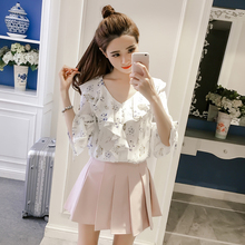 2017夏装新款韩版女装喇叭袖荷叶边宽松系带碎花雪纺衫女上衣潮