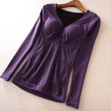 秋冬加绒打底衫女长袖修身保暖上衣女百搭V领加厚带胸垫免穿文胸