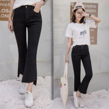 2017韩版高腰黑色九分喇叭牛仔裤女不规则毛边修身显瘦微喇9分裤