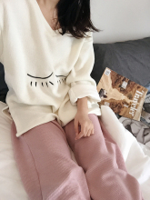 V领独家设计 秋冬针织休闲简约韩国chic风笑脸睫毛女士居家服套装
