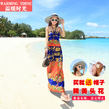 温暖时光 沙滩裙波西米亚印花连衣裙夏拖地长裙挂脖抹胸大码显瘦