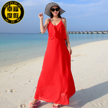 巴厘岛雪纺海边度假沙滩裙修身显瘦长裙燕尾大红露背吊带连衣裙仙