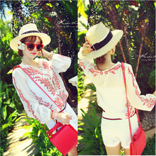 2017夏海边度假沙滩裙显瘦波西米亚大码短裙V领刺绣白色连衣裙女
