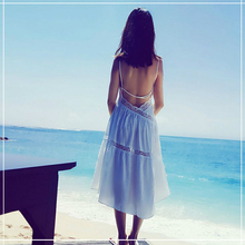 海滩裙沙滩裙海边度假波西米亚蕾丝中长款白色大露背吊带连衣裙夏