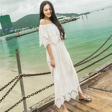 2017海边旅游度假沙滩裙长裙白色一字领高腰显瘦露肩连衣裙女夏