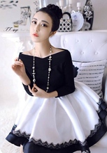 欧洲站春季新款蕾丝性感夜店名媛一字领露肩大摆公主裙蓬蓬连衣裙