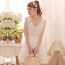 秋千梦 甜美小香风 2017夏修身V领蕾丝雪纺超仙蓬蓬无袖连衣裙女
