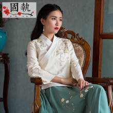 固执2017女装春款文艺复古绣花系带交领汉服长袖上衣短外套