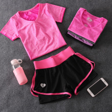 瑜伽服三件套健身房运动套装女夏季短袖速干衣跑步服假两件运动裤