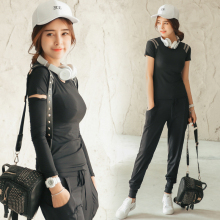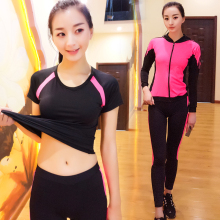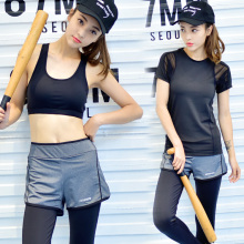 春夏新款瑜伽健身服三件套 短袖上衣假两件长裤 修身显瘦跑步服女