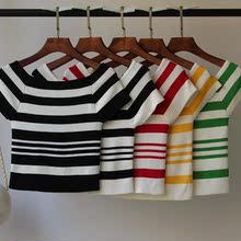 2017新款超短款短袖冰丝针织衫女条纹间色高腰露肚脐修身套头T恤