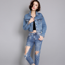 破洞薄款牛仔时尚套装女2017春夏新款浅色宽松牛仔九分裤两件套潮