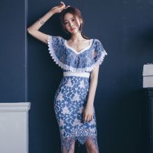 蕾丝连衣裙女夏2017新款夜店性感女装镂空短袖修身包臀荷叶边裙子