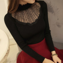 秋装新款韩版烫钻半高领毛衣女套头修身长袖针织衫蕾丝打底衫