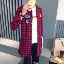 2017衬衫男长袖修身韩版格子中长款衬衣青年潮流春款男休闲上衣