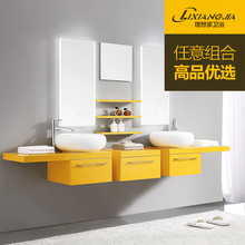理想家黄色实木浴室柜双盆卫浴柜 简约现代LED灯镜浴室柜组合双盆
