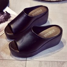 2016夏新款韩版时尚百搭女室外坡跟松糕厚底高跟鱼嘴黑白色凉拖鞋