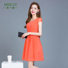 女装2016夏装新品雪纺连衣裙女韩版修身显瘦a字裙短袖圆领裙子