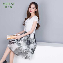 2017夏装新款裙子短袖雪纺连衣裙女韩版修身印花中长款显瘦A字裙