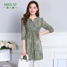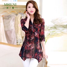2016春夏装新款V领七分袖印花中长款大码雪纺衬衫优雅气质衬衣女