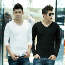 春秋季纯棉打底衫男士V领长袖T恤纯色黑白韩版修身男装潮流上衣服