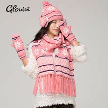 GLOVIN冬季韩版圣诞新年雪花针织加绒保暖帽子围巾手套三件套装女
